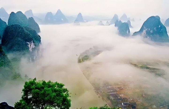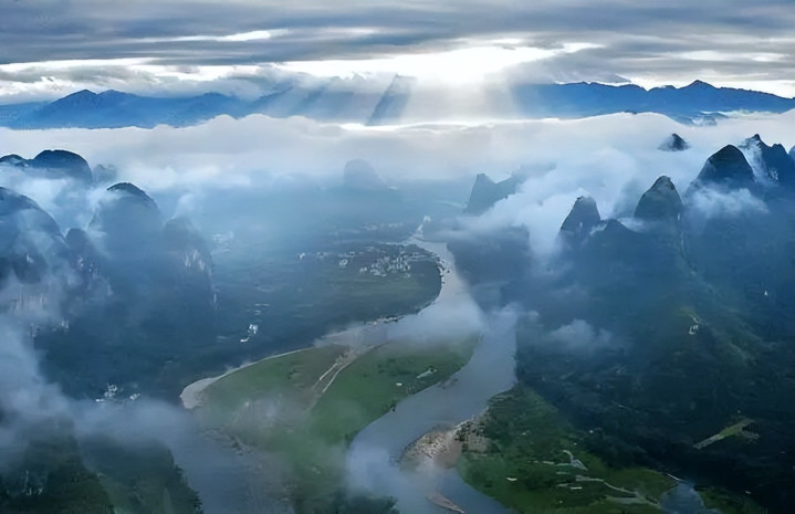 离兴坪不远的老寨山不错看到兴坪最好的时势,亦然看日出日落的佳处,老寨山屹立在层层云海之中,一齐谈光芒透过云层射向漓江,倒影玄妙;遇龙河两畔群山叠翠,田铸平坦,组成一幅好意思轮好意思奂的萧疏自得图。